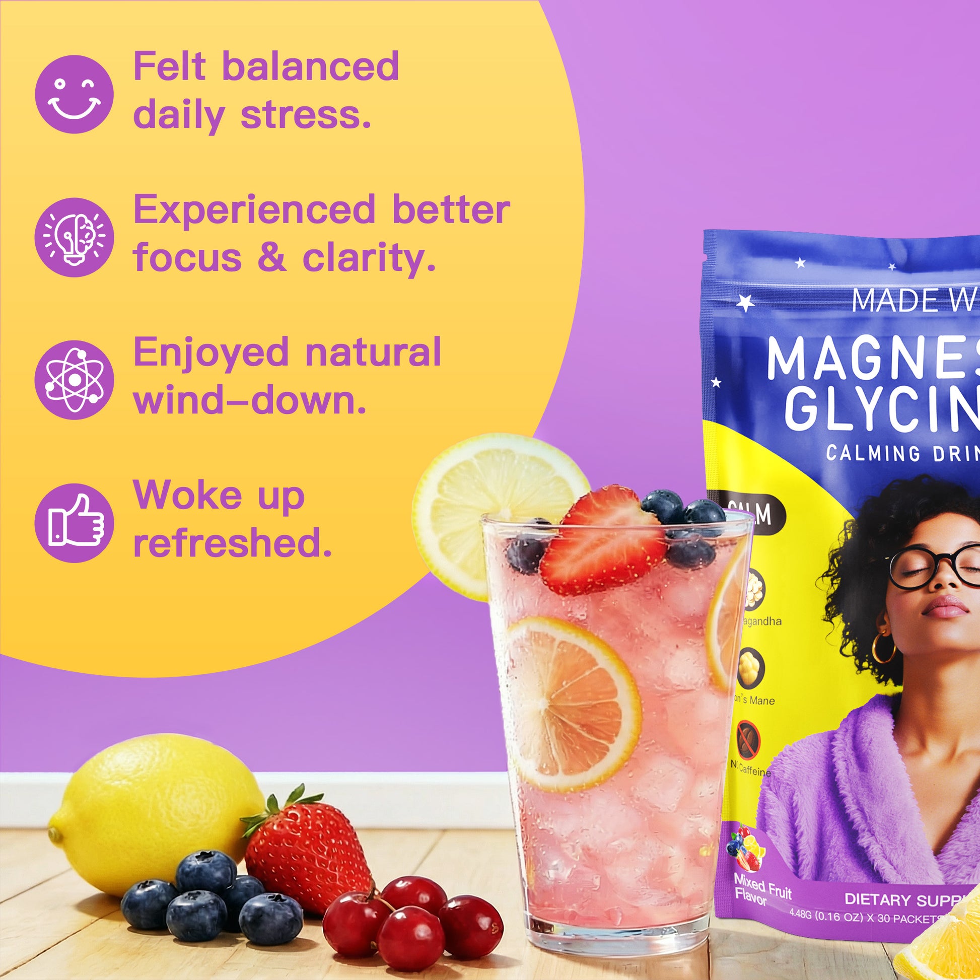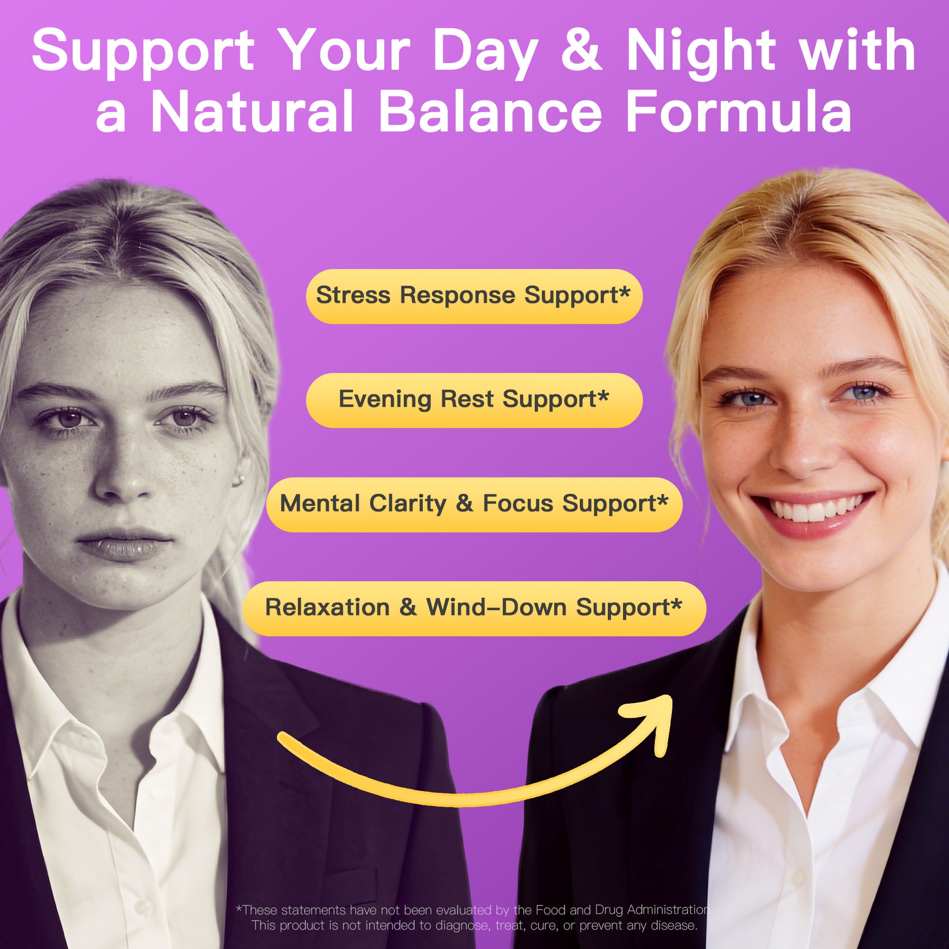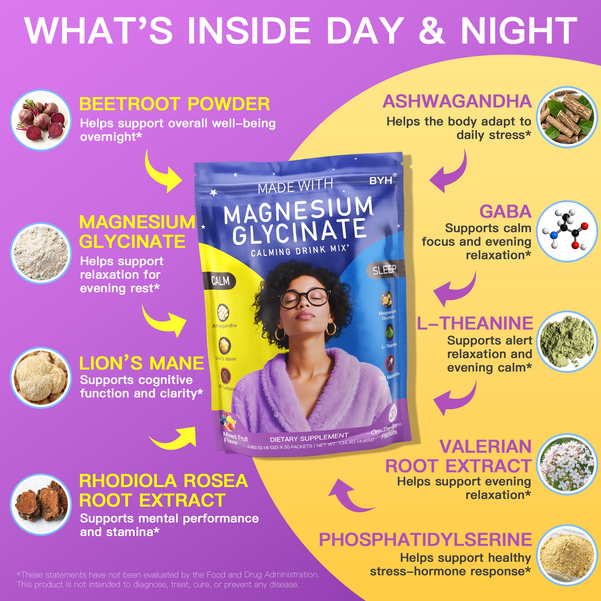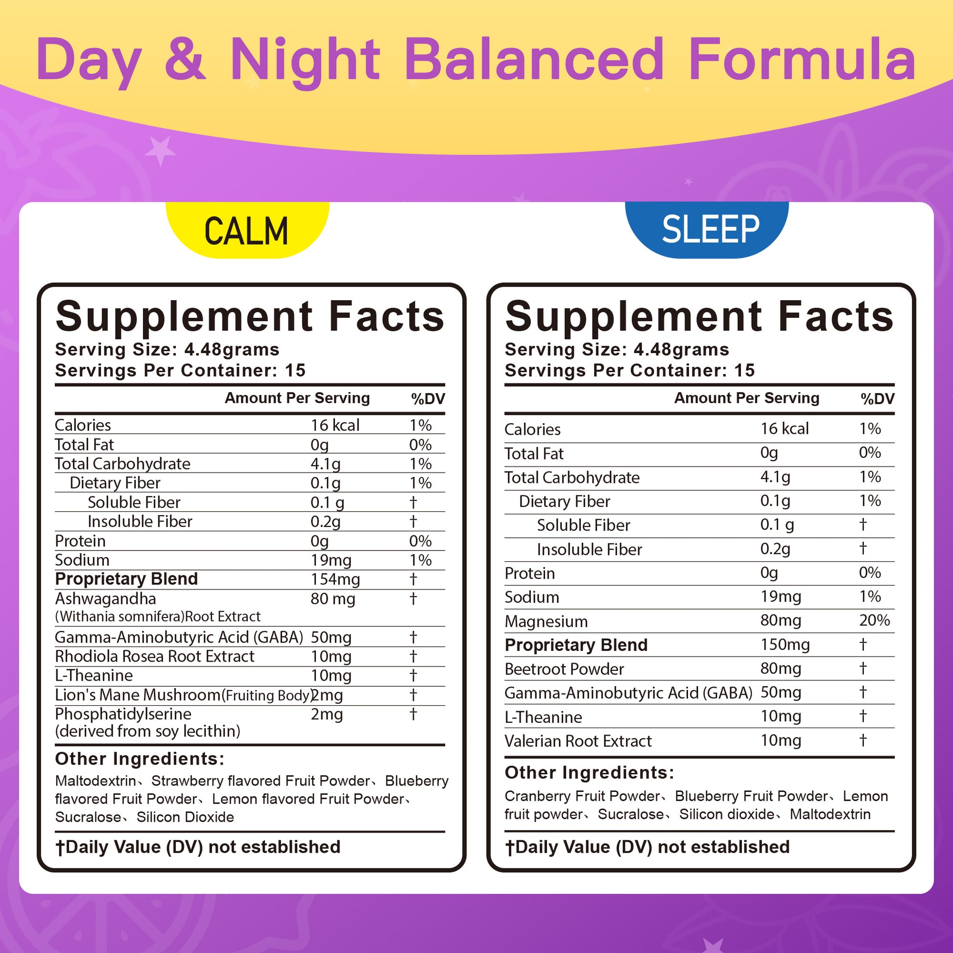 Day & Night Powder Combo Pack: Includes 15 daytime powder packets enriched with ashwagandha, rhodiola, and lion's mane mushroom; plus 15 nighttime powder packets enriched with magnesium and valerian root. Helps working women and homemakers maintain calm during busy days and enjoy peaceful nights.